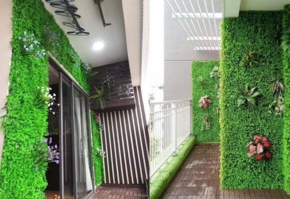 Ban công sẽ trở nên bắt mắt hơn khi trang trí bằng những loại hoa lá giả kết hợp, với mức giá thi công chỉ từ khoảng 400k/m2 tùy vào loại hoa lá mà quý anh chị lựa chọn